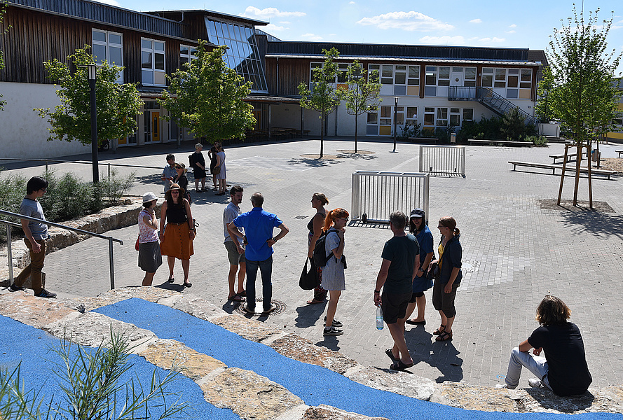 An diesem Freitag lag der Schwerpunkt auf Projekten in Ingelheim. Als erstes steuerten wir die Pestalozzischule an, deren Schulhof in mehreren Bauabschnitten von uns weiterentwickelt wird. Hier standen insbesondere bautechnische Fragen in Verbindung mit Anforderungen des Denkmalschutzes im Vordergrund. Als zweites Projekt wartete der gerade eröffnete „Platz am alten Gymnasium“ auf uns. Mittelpunkt des kleinen und feinen Stadtteilplatzes ist der skulpturale Brunnen aus Sandstein: an diesem heißen Sommertag ideal für eine Abkühlung.