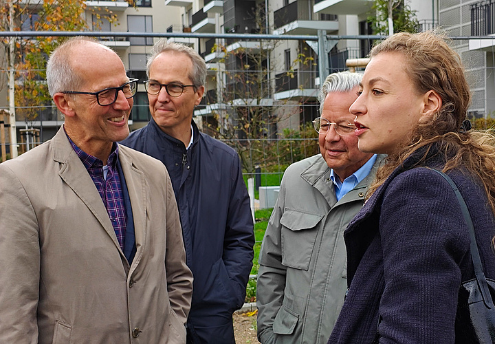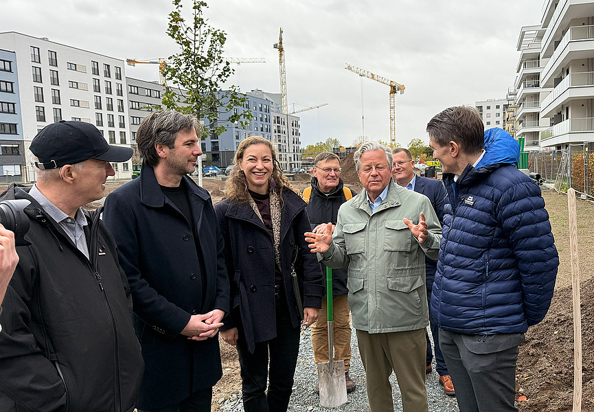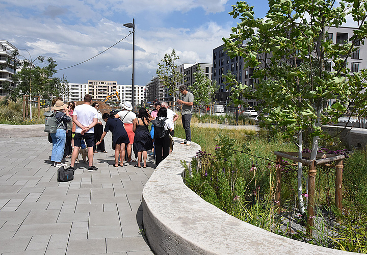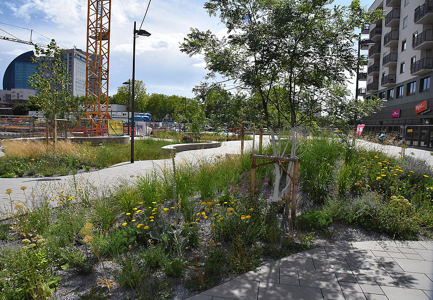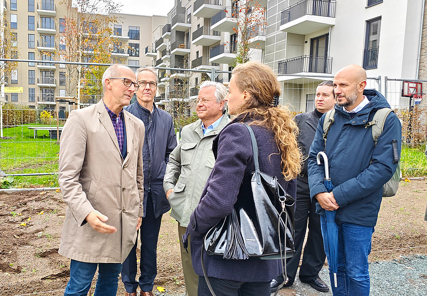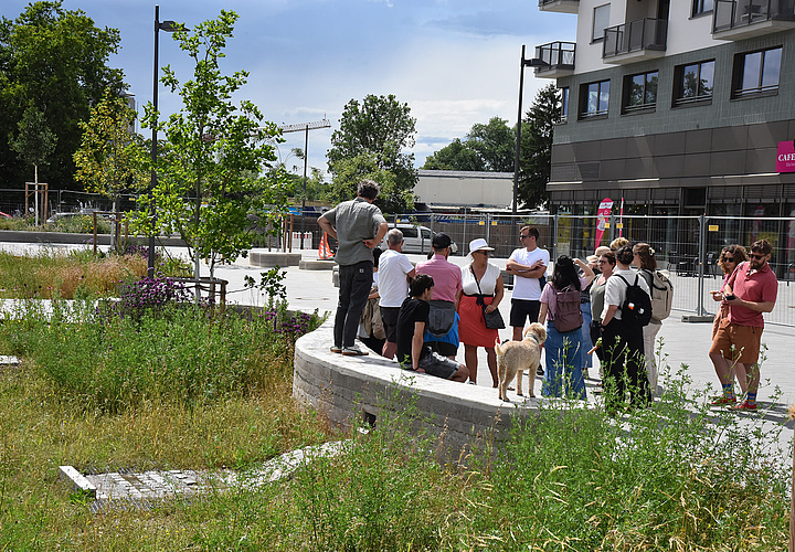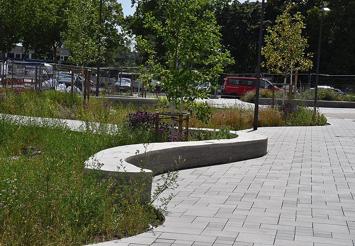 Der langgestreckte Park gliedert sich in einen östlichen und westlichen Teil. In seiner Mitte verbindet der Quartiersplatz, das neue Zentrum des Schönhofviertels, beide Parkteile miteinander. Der Platz, an dem Einkaufsmöglichkeiten, Cafés und zukünftig auch der Eingang zur ersten Hybrid-Grundschule Hessens liegen wird, wurde bereits im Sommer fertiggestellt. Bereits im Juni dieses Jahres konnten wir ihn bei einer Baustellenbesichtigung begehen.