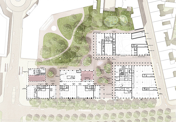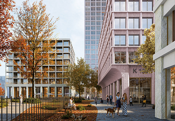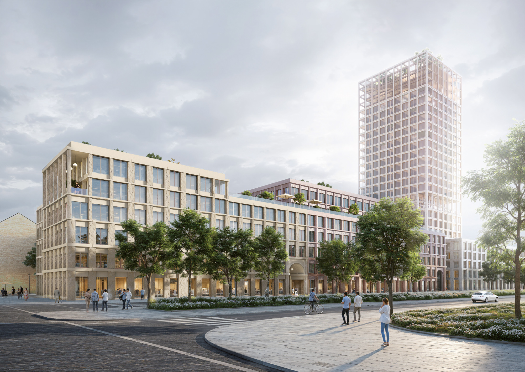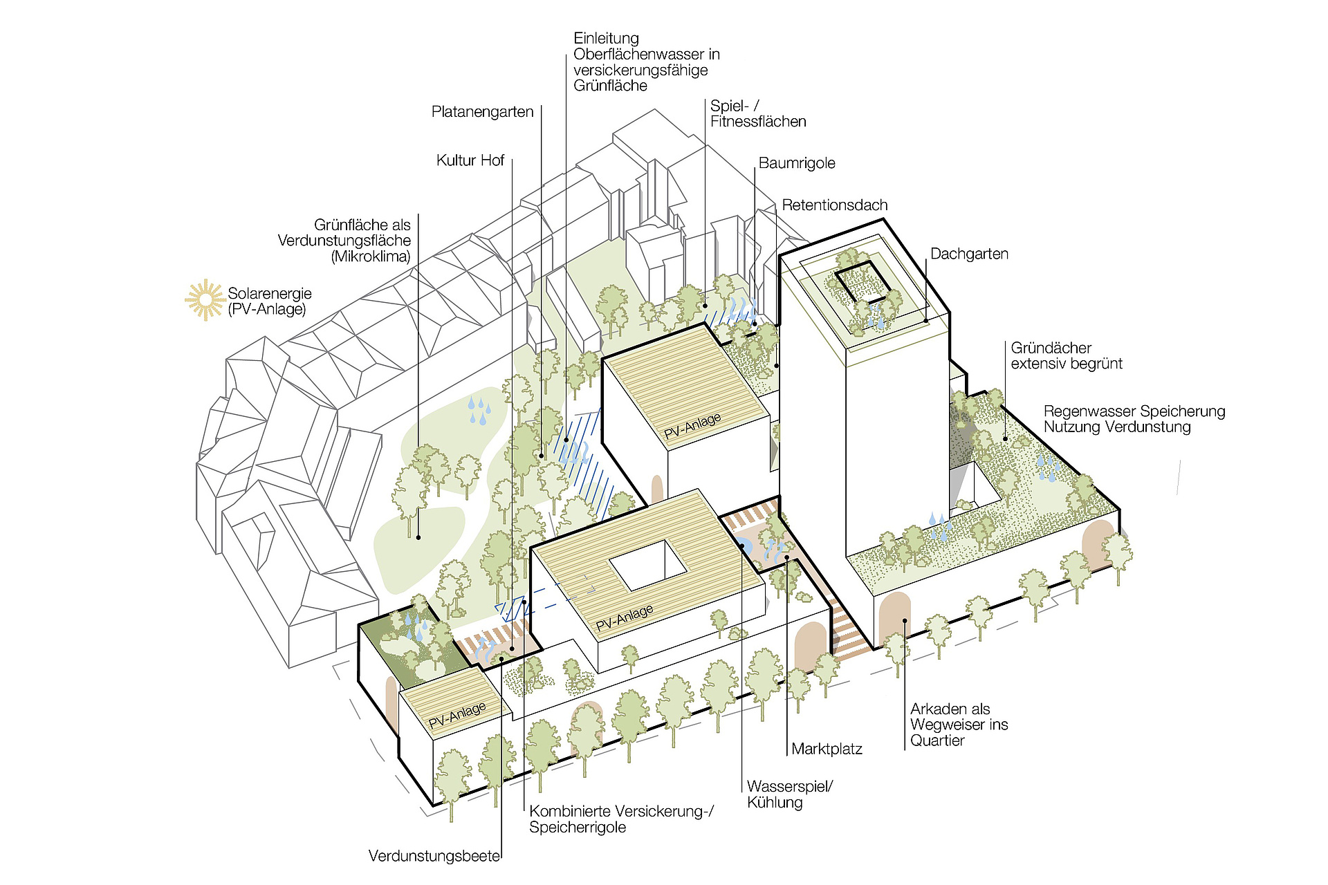 Der Entwurf für das Postbank-Areal in Karlsruhe antwortet auf die städtebauliche Schlüssellage zwischen der historischen Fächerstadt und der südlichen Stadterweiterung mit einem kraftvollen, differenzierten Ensemble. Die städtebauliche Figur greift die Karlsruher Blockrandstruktur auf, öffnet sich jedoch gezielt an den städtischen Schnittstellen mit Arkadengängen, durchlässigen Höfen und differenzierten Höhenstaffelungen.