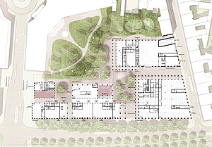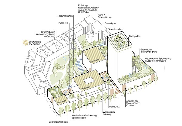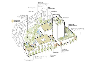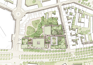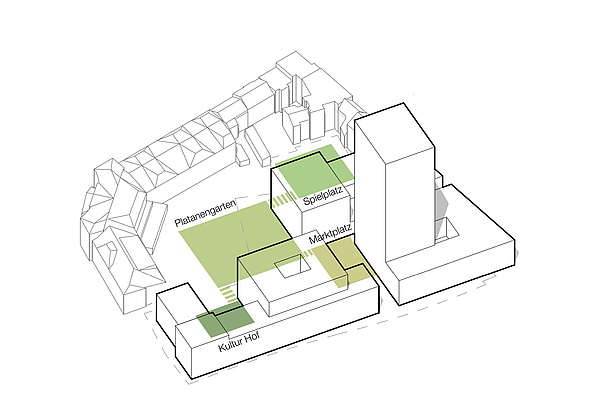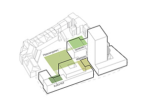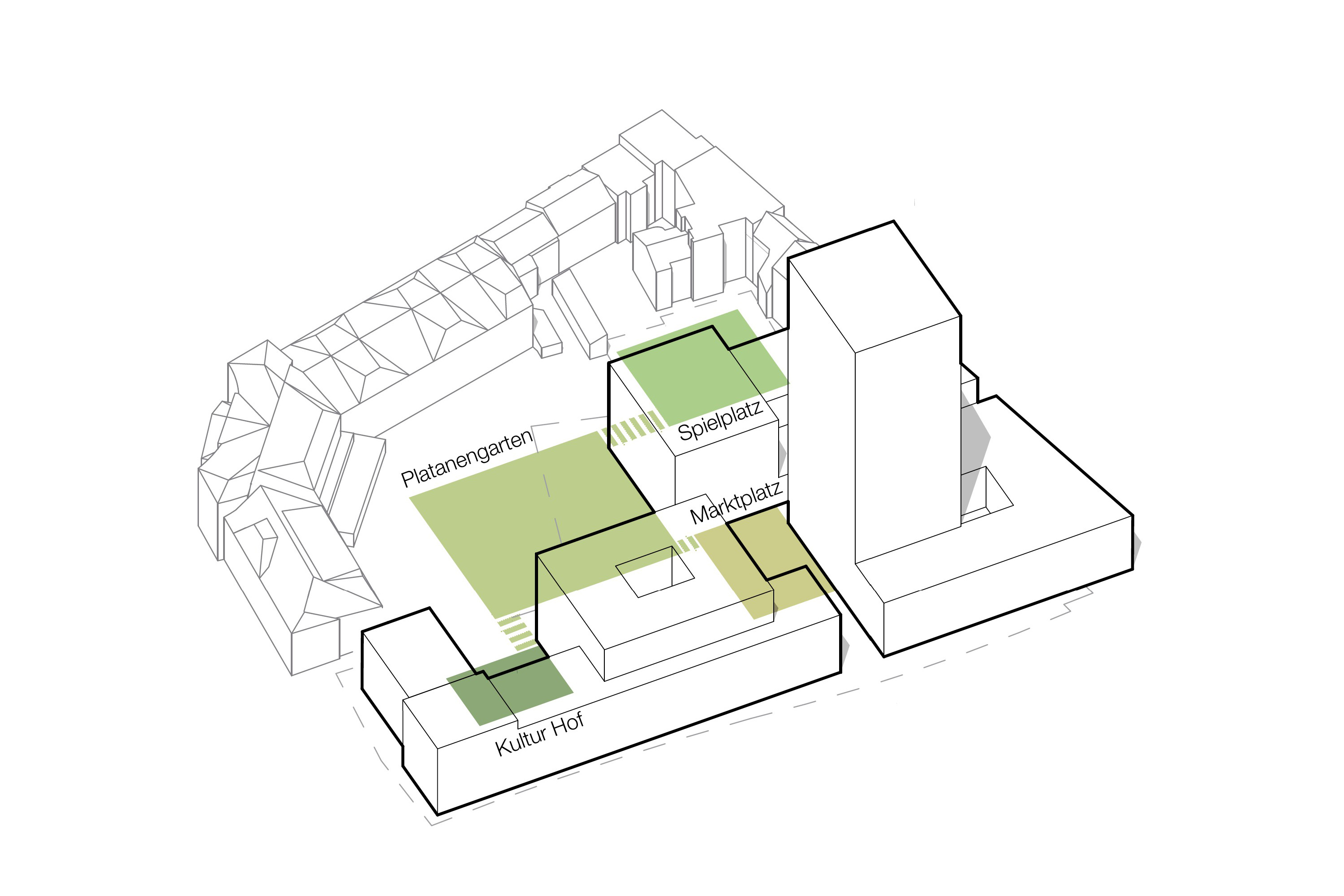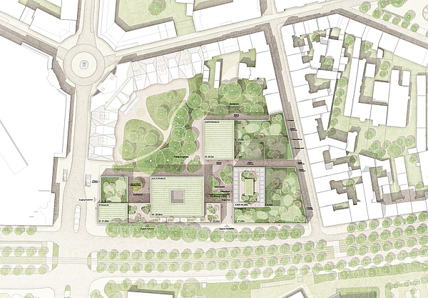 Die Idee der Freiraumkonzeption ist die Fortführung des Gartens des Markgräflichen Palais. Der historische Garten dehnte sich im 19. Jahrhundert noch deutlich über die Grundstücksgrenzen nach Osten hin aus und hat hier die Chance, einen Teil seiner Wirkung wieder zurückzuerhalten. Die landschaftliche Gestaltung des Gartens fließt durch das Ensemble und erfährt sukzessive eine Morphose hin zu einer urbanen Gestaltung, die den Anforderungen an intensiv genutzte, multifunktionale Freiräume entspricht. Die neuen Freiräume diffundieren über eine spannende Abfolge von Arkaden, Kolonnaden und Plätzen durch das Areal.